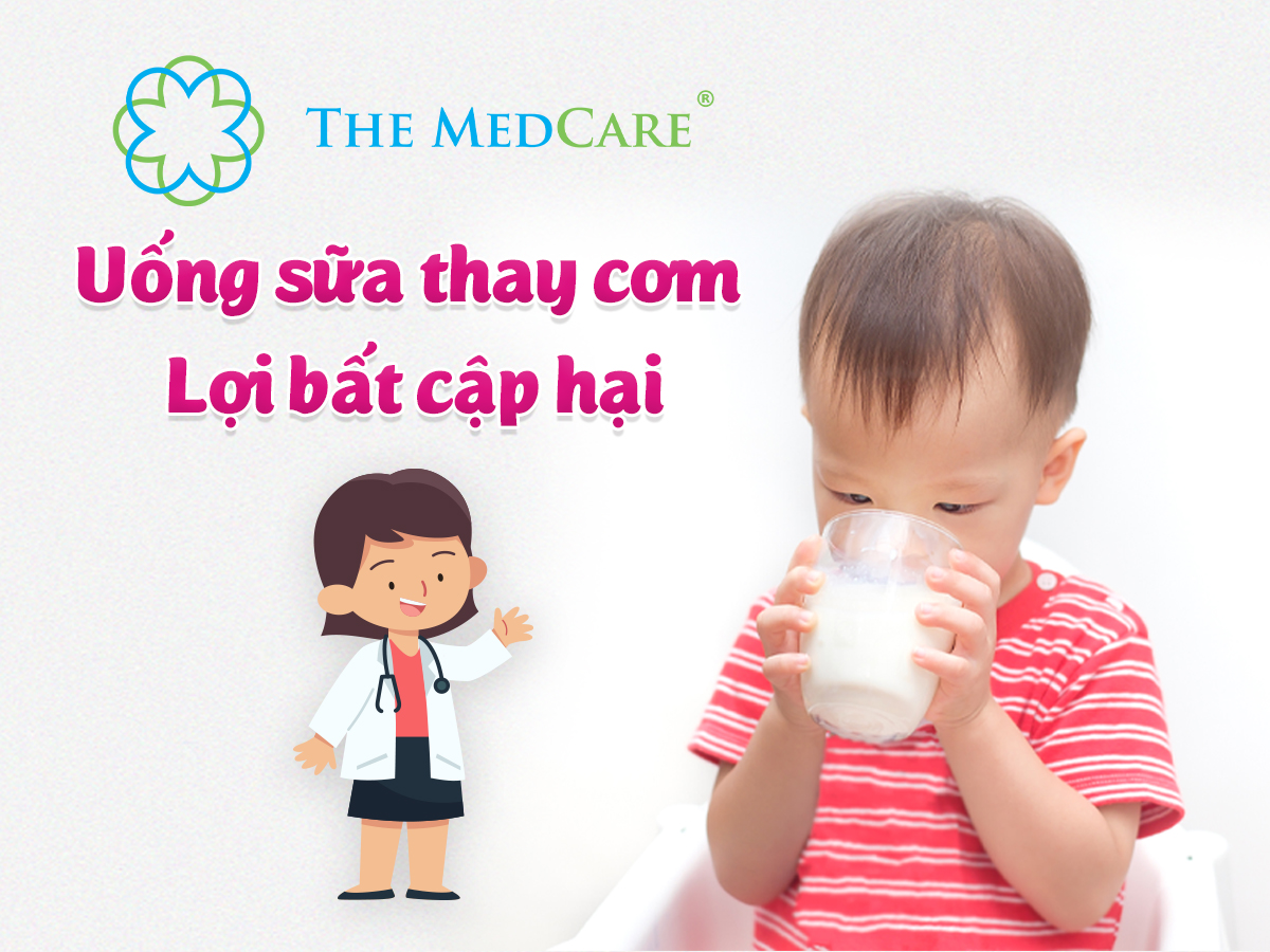 UỐNG SỮA THAY CƠM: LỢI BẤT CẬP HẠI Sai lầm của rất nhiều gia đình là cho trẻ uống quá nhiều sữa vì sợ con thiếu dinh dưỡng khi không chịu ăn cháo hay cơm. Ví dụ điển hình từ 1 trường hợp thực tế tại The Medcare: Bé gái 3 tuổi đến khám trong