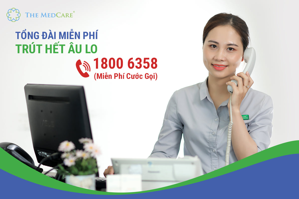 TỔNG ĐÀI MIỄN PHÍ – TRÚT HẾT ÂU LO Chỉ với thao tác gọi đơn giản tới tổng đài 1800 6358 hoàn toàn miễn phí cước gọi của The Medcare, bạn sẽ trút bỏ được mọi lo lắng và đáp ứng những nhu cầu từ đặt lịch hẹn khám, tư vấn dịch vụ khám,