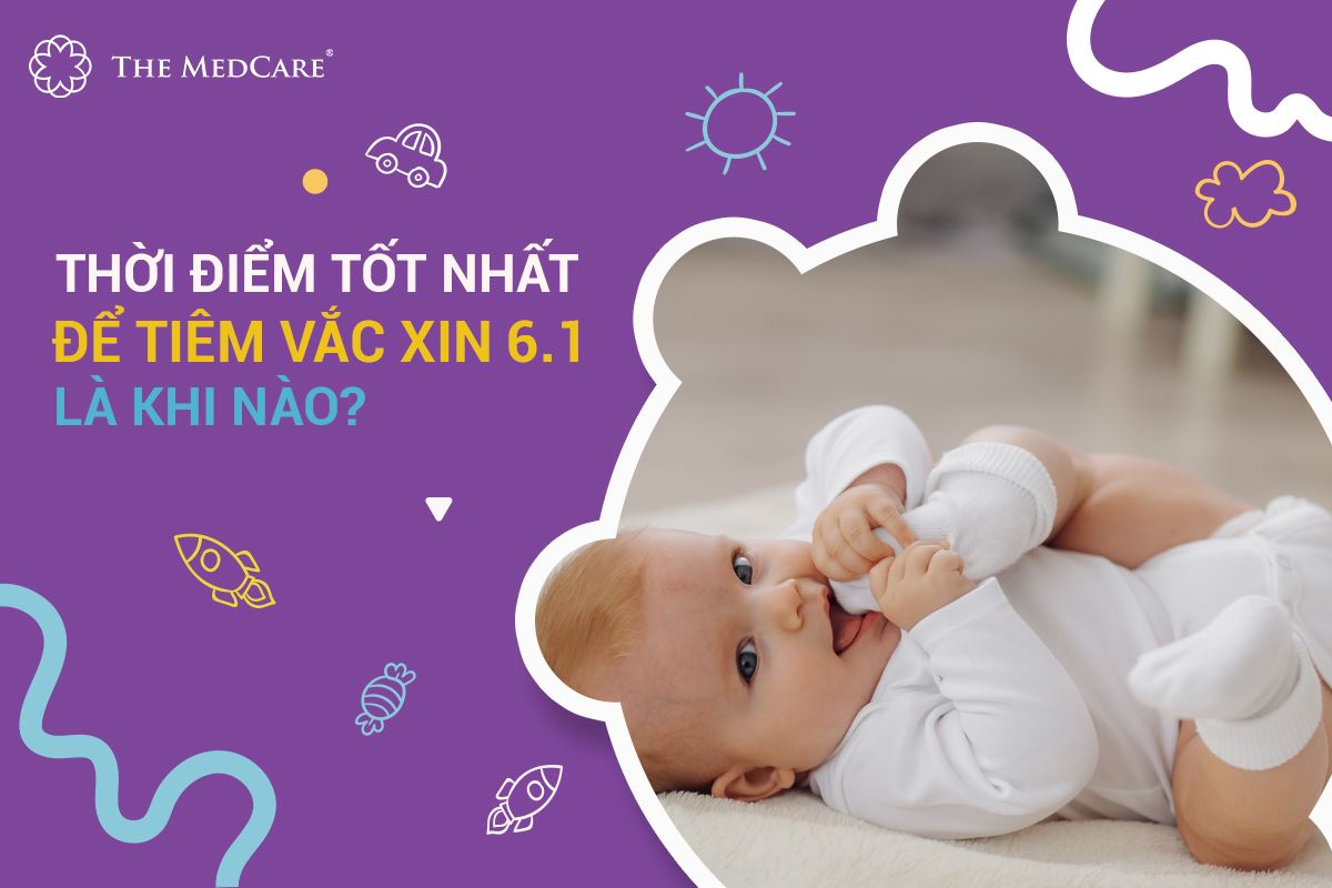 THỜI ĐIỂM TỐT NHẤT ĐỂ TIÊM VẮC XIN 6.1 LÀ KHI NÀO? Theo hướng dẫn của nhà sản xuất, độ tuổi sớm nhất trẻ có thể tiêm được vắc xin 6.1 là khi đủ 6 tuần tuổi Trên thực tế, nhiều bác sĩ tư vấn có thể đợi tới khi trẻ được 2 tháng tuổi